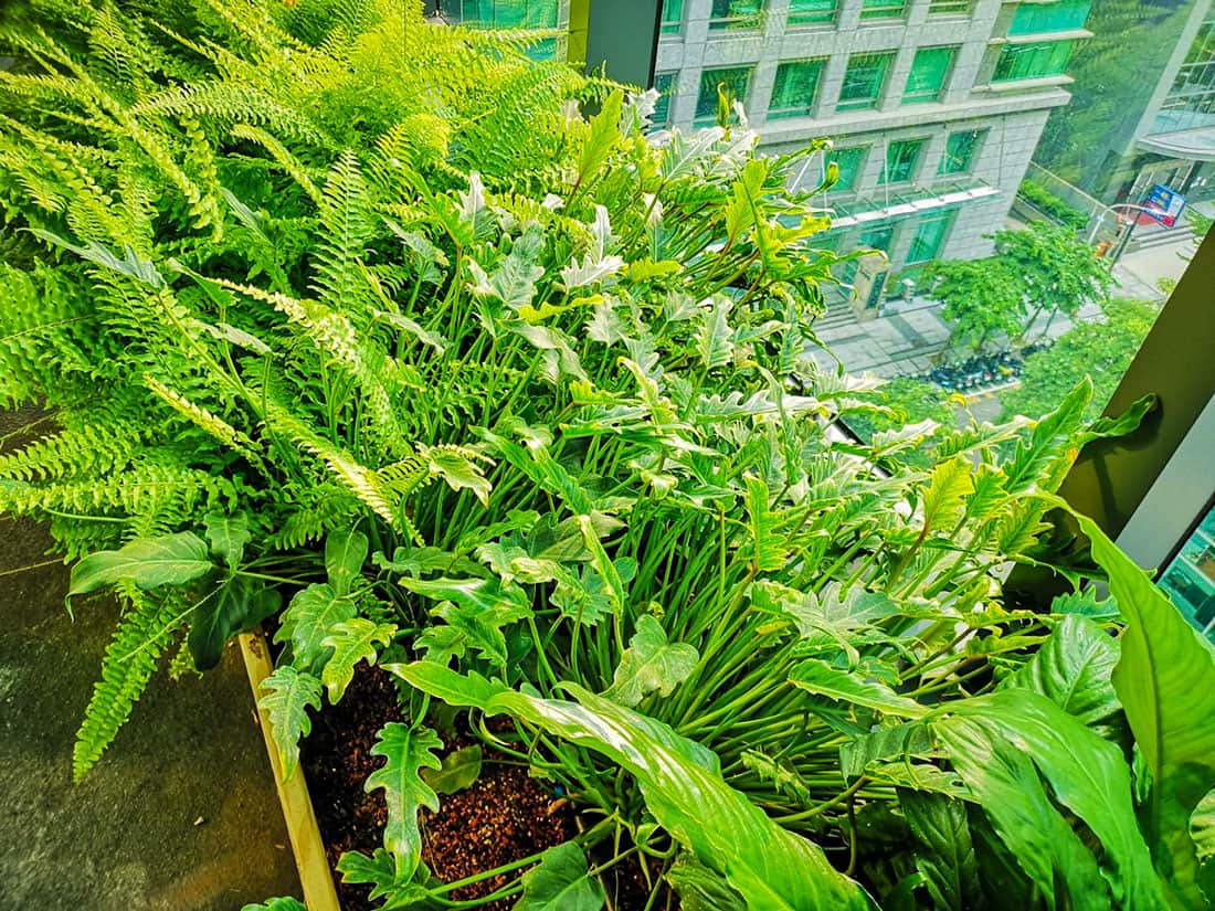 辦公室綠化不僅能夠讓員工工作心情有所調適,也能改善辦公室單調的布置。內湖科技公司將閒置的陽台空間設置一排的綠色植栽,採用寶銳植生座,工程簡單,不破壞原有建物,淺層介質,水土分離,植物生長良好。